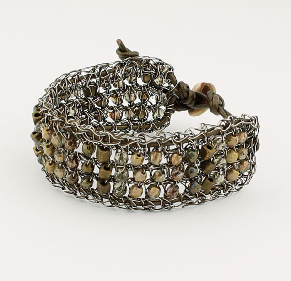 CVT762:Antique bronze crocheted wire single wrap bracelet with shell button, fire polished Czech glass and Japanese seed beads with leather cord
