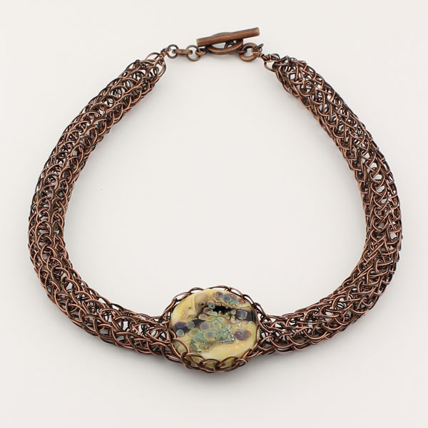 KCQ711: Antique copper knitted copper wire necklace with exposed handmade glass bead & toggle closure