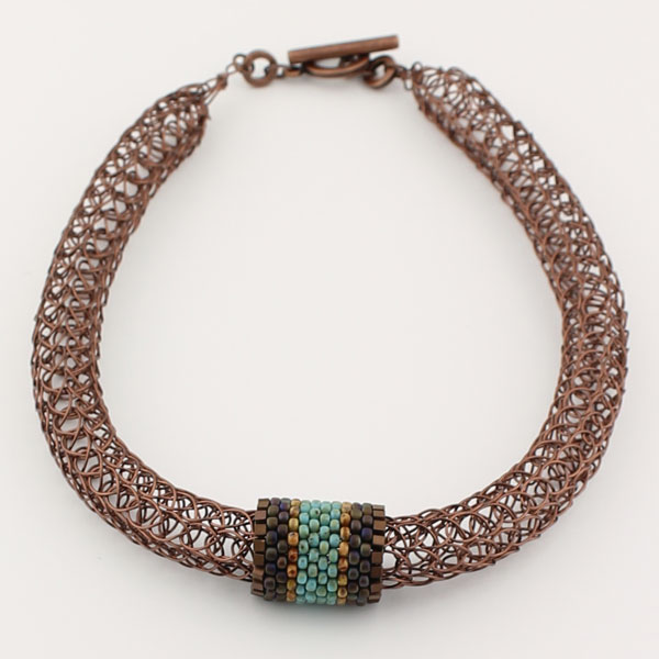 CP778: Knitted antique copper color wire necklace with turquoise, copper, & gold bead woven slider bead