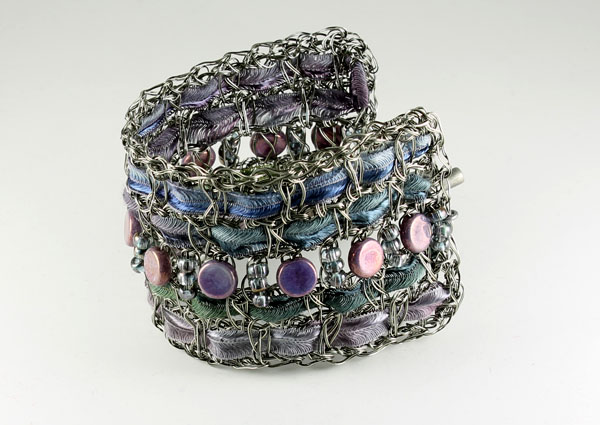 Presenting familiar textile patterns in unexpected materials, my wire bracelets are both funky and fashionable. Embellishing the copper wire are textile accents that include ribbon yarns, chenille, and novelty ribbons in a variety of textures and colors. Czech glass beads add a textural contrast and a unique look. Multiple sizes are available.