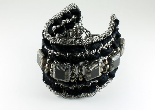 CHT589: Antique gunmetal crocheted wire bracelet with toggle clasp, black chenille and chunky glass beads