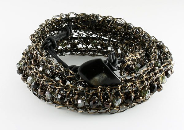 Czech glass beads mixed with Japanese seed beads are crocheted on to leather cord with antique look copper wire . Leather colors include 3 metallic colors and black. Buttons are carefully selected to complement the textures and colors. All bracelets are adjustable.