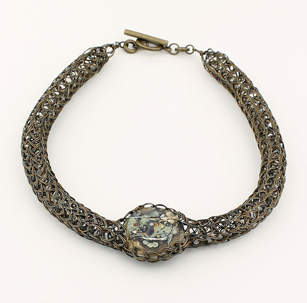 KHV711: Dark antique bronze knitted necklace with handmade bead & toggle clasp