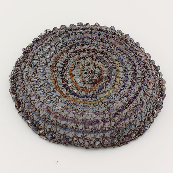 CCH214: Antique copper crocheted wire kippah with variegated eggplant yarn with beaded edge