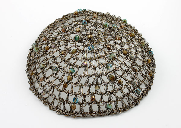 CVT136: Antique bronze crocheted wire kippah with neutral and aqua beads