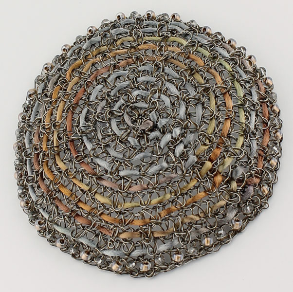 CVT230: Antique bronze crocheted wire kippah with metallic color variegated satin cord and beaded edge