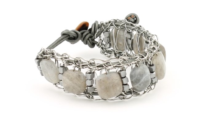 Gemstone beads mixed with bronze or hematite accent beads are crocheted on to leather cord with antique look copper wire. Leather colors include 3 metallic colors and black. Buttons are carefully selected to complement the textures and colors.
