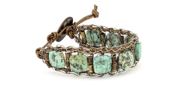 Gemstone beads mixed with bronze or hematite accent beads are crocheted on to leather cord with antique look copper wire. Leather colors include 3 metallic colors and black. Buttons are carefully selected to complement the textures and colors.