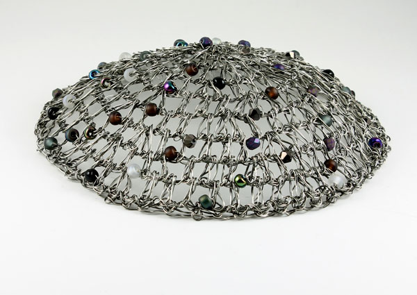 CHT106: Antique gunmetal crocheted wire kippah with teal/brown/metallic beads
