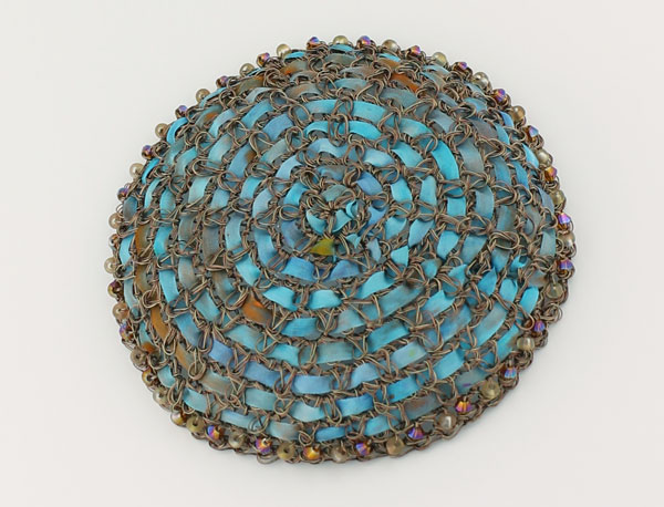 CCG231: Antique copper crocheted wire kippah with turquoise variegated silk ribbon and beaded edge
