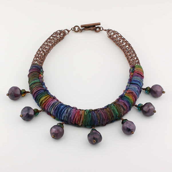 CP752: Antique copper knitted copper wire necklace with variegated ribbon and purple resin & glass dangle beads