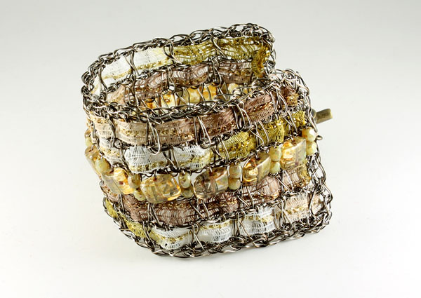 Presenting familiar textile patterns in unexpected materials, my wire bracelets are both funky and fashionable. Embellishing the copper wire are textile accents that include ribbon yarns, chenille, and novelty ribbons in a variety of textures and colors. Czech glass beads add a textural contrast and a unique look. Multiple sizes are available.