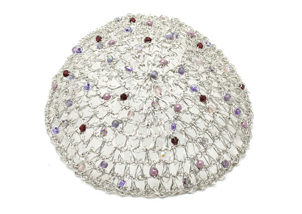 CST195: Silver crocheted kippah with purple/lilac beads